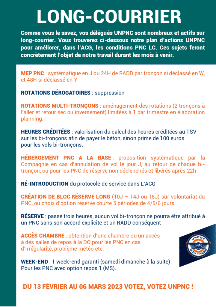 NOTRE PLAN D’ACTIONS LONG COURRIER Auteur/autrice de la publication :La rédaction Publication publiée :février 3, 2023 Post category:Actualités Air France Read more articles Article précédentNOTRE PLAN D’ACTIONS MOYEN-COURRIER Article suivantELECTIONS CSE 2023 – UNPNC : MANDAT 2019 – 2023 Vous devriez également aimer Cmc Biométrique janvier 16, 2019 Enquête-Action nationale sur le cancer du sein juillet 22, 2019 Ho Ho Ho, Cadeau au adhérent UNPNC décembre 9, 2019