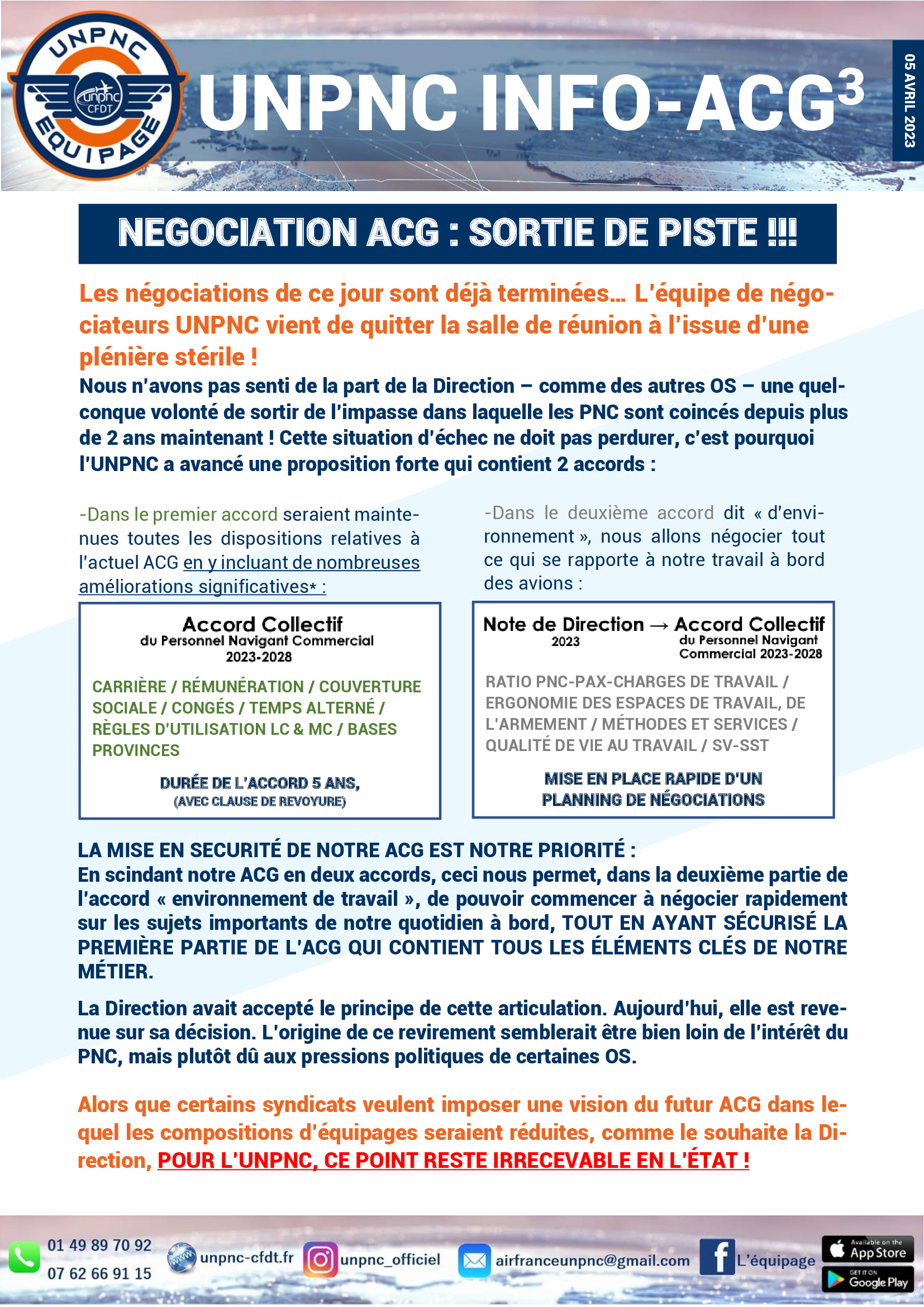 UNPNC INFO – ACG 3 Auteur/autrice de la publication :La rédaction Publication publiée :avril 5, 2023 Post category:Actualités Air France TELECHARGEZ NOTRE TRACT Read more articles Article précédentUNPNC INFO-ACG2 Article suivantCOUP D’ARRET Vous devriez également aimer ACG : PREMIERES EVOLUTIONS ! décembre 5, 2023 GESTION PAIE PNC octobre 23, 2019 COUP D’ARRET avril 9, 2023