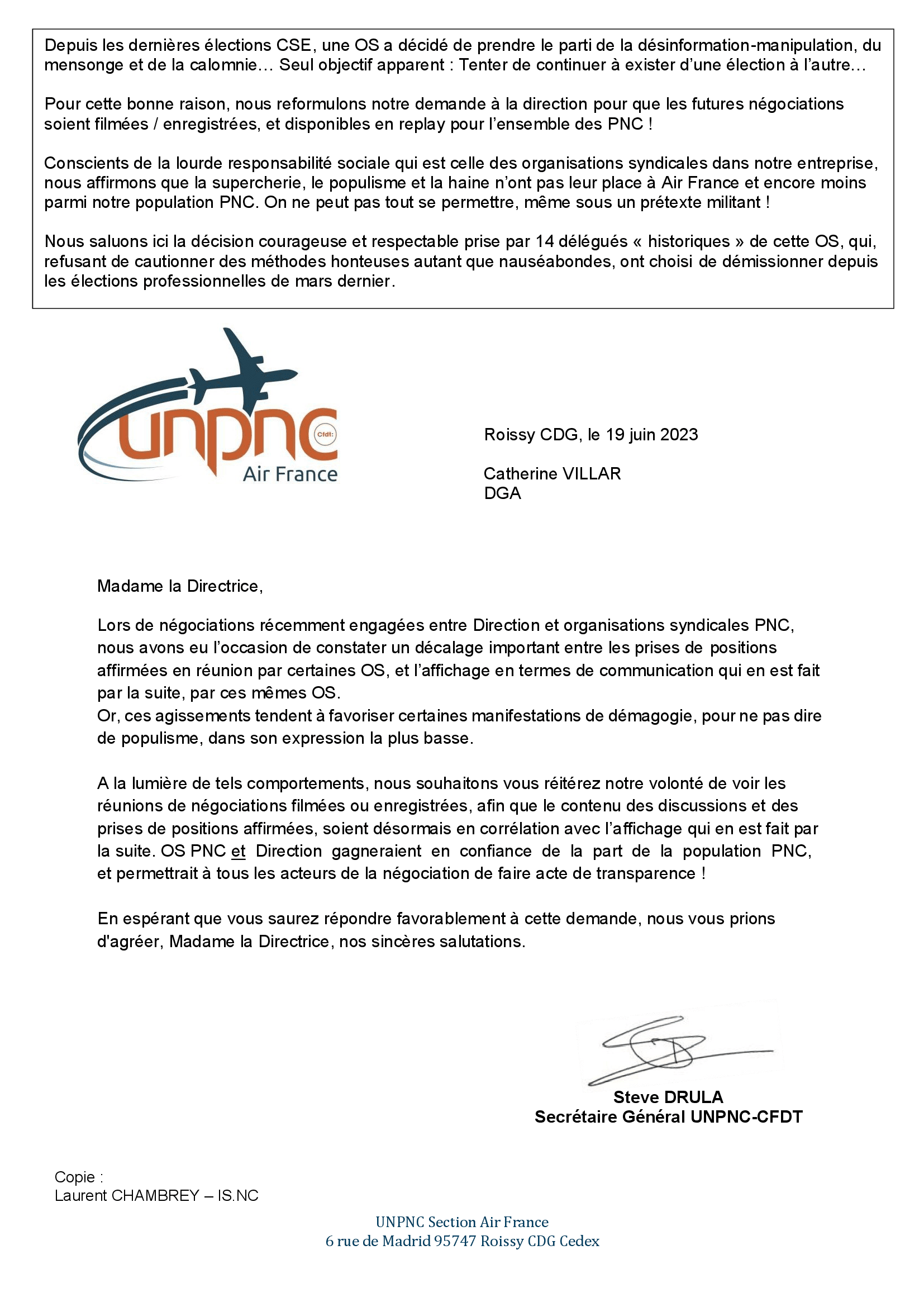 L’UNPNC DEMANDE A LA DIRECTION QUE LES NEGOS SOIENT FILMEES Auteur/autrice de la publication :La rédaction Publication publiée :juin 20, 2023 Post category:Actualités Air France Read more articles Article précédentPRIME « NUIT DE VOL » MULTI-TRONÇONS Article suivantCSSCT NEWS UNPNC – JUIN2023 Vous devriez également aimer L’Unpnc s’associe au SAMU décembre 2, 2018 Flash news UNPNC novembre 6, 2018 Petit rappel afin de mieux comprendre le calcul de l’augmentation de salaire. novembre 12, 2018