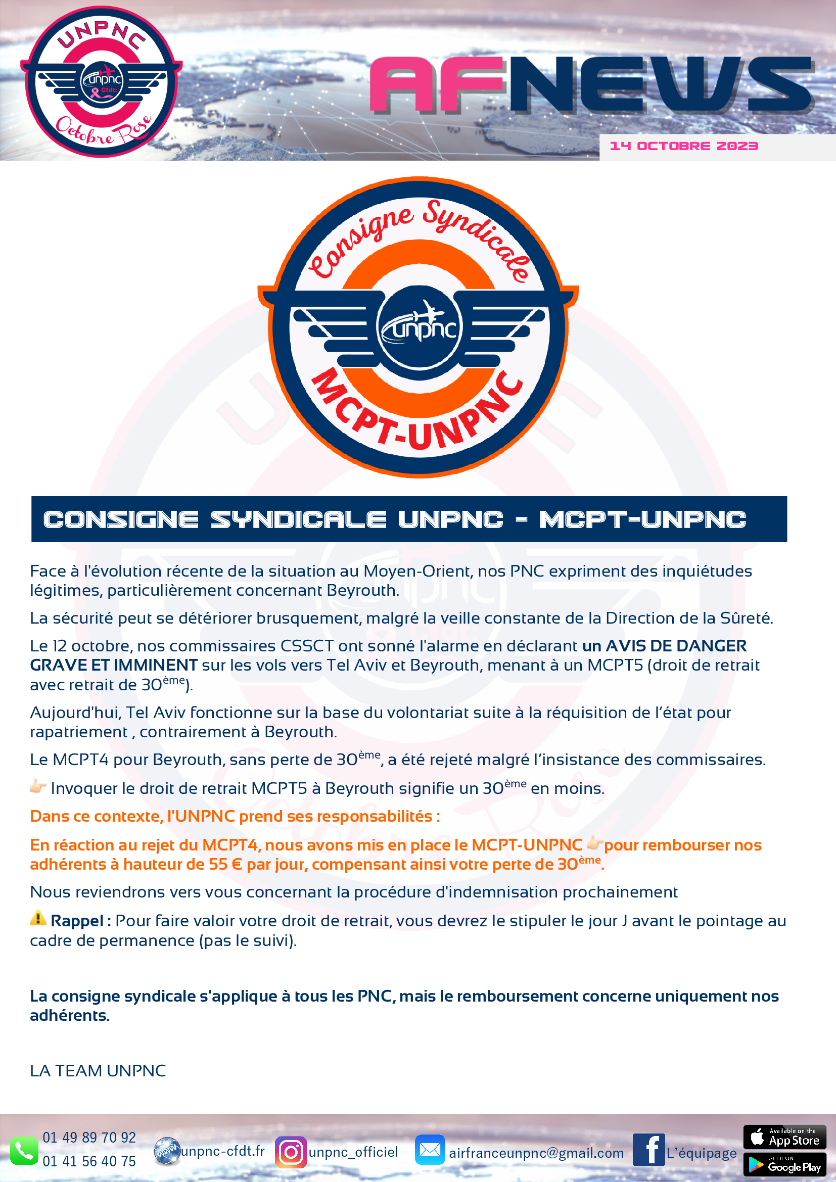 CONSIGNE SYNDICALE UNPNC – MCPT-UNPNC Auteur/autrice de la publication :La rédaction Publication publiée :octobre 14, 2023 Post category:Actualités Air France TELECHARGEZ NOTRE TRACT Read more articles Article précédentRESPECT DU DEVOIR DE RÉSERVE EN MISSION / HORS MISSION / ESCALE / RÉSEAUX SOCIAUX Article suivantOUVERTURE DES INSCRIPTIONS COLOS HIVER ET PRINTEMPS Vous devriez également aimer VENDREDI 8 MARS, JOURNEE DE LA FEMME février 27, 2019 PREVENTION PALU mai 12, 2023 OUTILS: La proratisation des repos arrive chez UNPNC Air France juillet 15, 2017