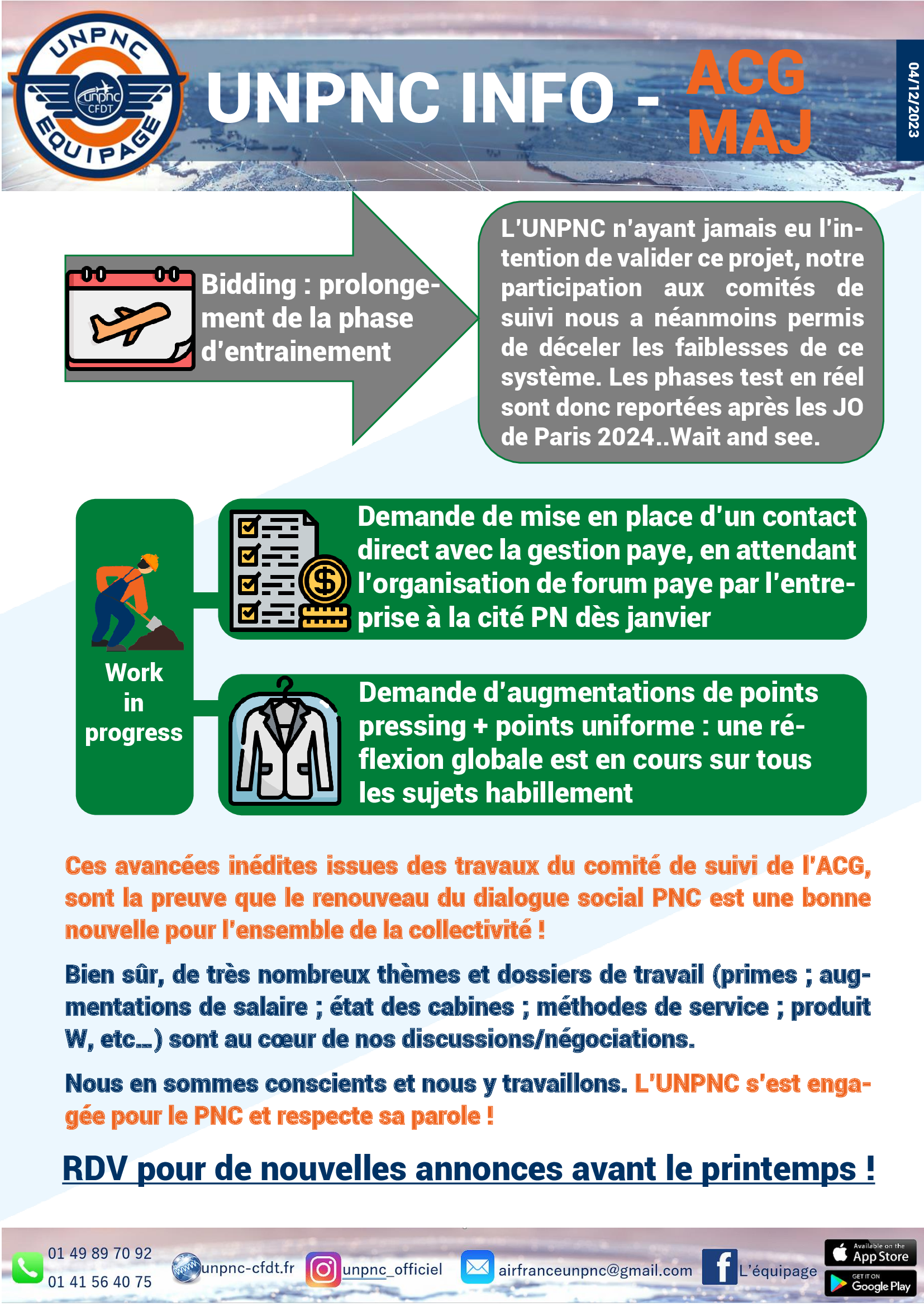 ACG : PREMIERES EVOLUTIONS ! Auteur/autrice de la publication :La rédaction Publication publiée :décembre 5, 2023 Post category:Actualités Air France Read more articles Article précédentACG – EVOLUTIONS EN APPROCHE… Article suivantEVOLUTIONS ACG Vous devriez également aimer GP, ENFIN UNE RÉFORME ? octobre 16, 2018 ?P.U.A: PRIME UNIFORME ANNUELLE❗ juin 8, 2020 UNPNC INFO-NAO 6 juin 2, 2023