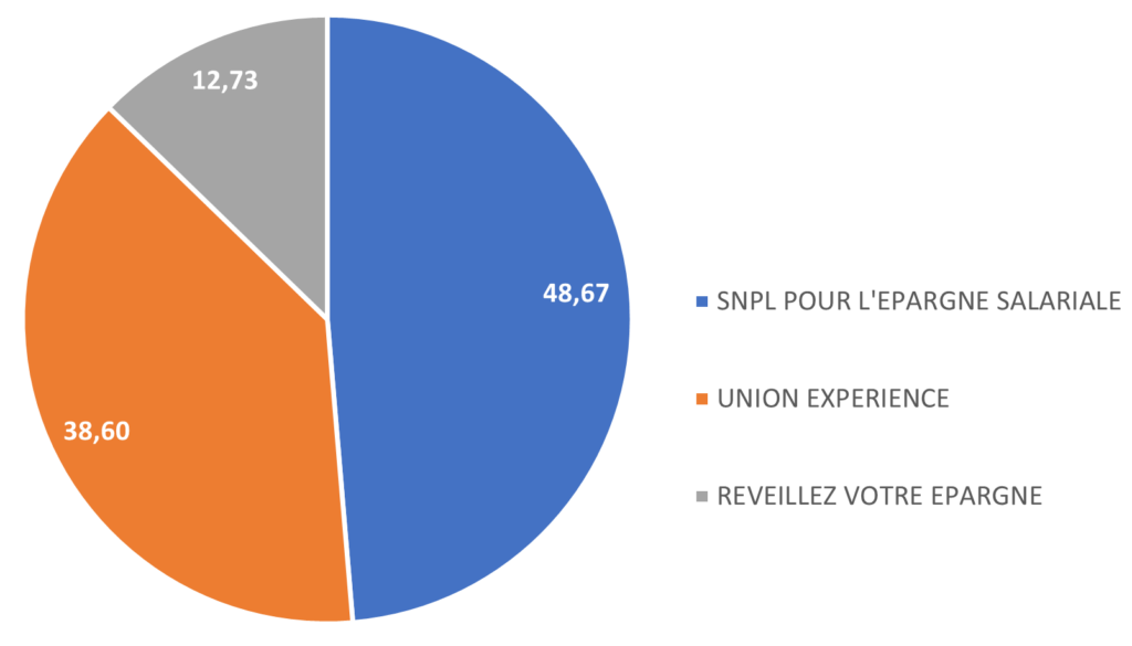 Nous arrivons en tête en nombre de sièges (UNION EXPERIENCE : 12 – SNPL POUR L’EPARGNE SALARIALE : 9 – REVEILLEZ VOTRE EPARGNE : 2)